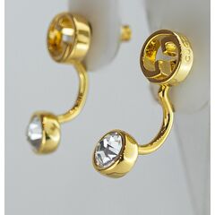 Серьги женские двухсторонние из гипоаллергенного ювелирного сплава желтого цвета. Вставка- ювелирное стекло, цвет- белый. Высота серег-1,0см, ширина-1,0см. Застежка- пусет.