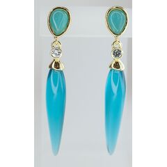 Серьги женские из гипоаллергенного ювелирного сплава желтого цвета. Вставка- улексит голубого цвета и белое ювелирное стекло. Высота серег-7,0см, ширина-1,0см. Застежка- пусет.