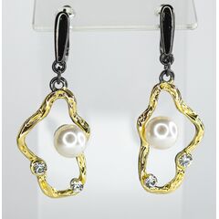 Серьги женские из гипоаллергенного ювелирного сплава черного и желтого цвета. Вставка- жемчуг иск. и ювелирное стекло белого цвета. Высота серег-4,0см, ширина-2,0см. Застежка- английская (штифт-1,0см).