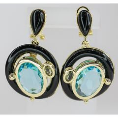 Серьги из гипоаллергенного ювелирного сплава желтого цвета. Вставка- кварц,цвет-голубой и керамика черного цвета. Высота серёг-4,0см, ширина-3,0см. Итальянский замок( штифт-1,2см и застежка-клипса).