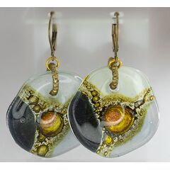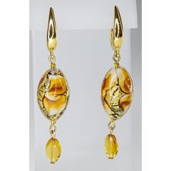 Серьги женские из гипоаллергенного ювелирного сплава желтого цвета. Вставка- муранское стекло, цвет- золотой с принтом оранжевого цвета. Высота серег--5,0см., ширина-2,0. Замок- английский со штифом -1,0см.