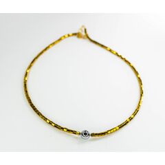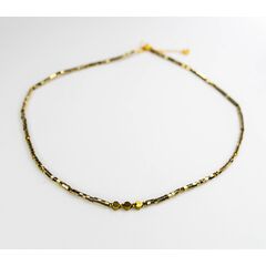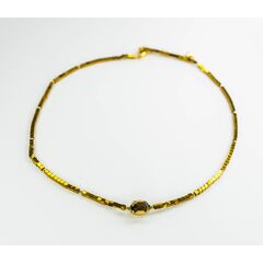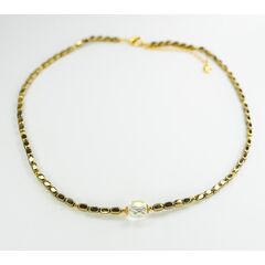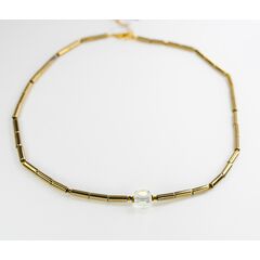 Колье-чокер из гипоаллергенного ювелирного сплава желтого цвета.Состоит из звеньев-трубок, длиной-0,9см.Вставка- кристалл, цвета мистик. Длина колье-40,0+5см. Замок- карабин.