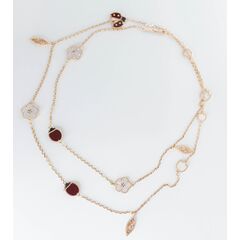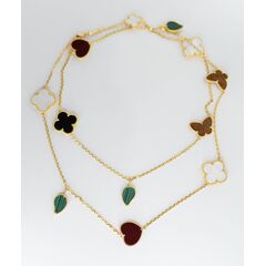 Колье (цепь) из высококачественного гипоаллергенного ювелирного сплава желтого цвета со вставками в виде фигурок цветов и бабочек. Покрытие эмалью красного, зеленого, черного цвета и перламутром белого цвета. Длина колье- 60,0см, без замка.