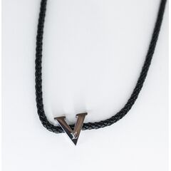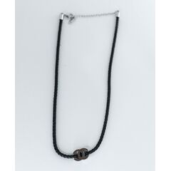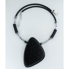 Колье из кожаного шнура черного цвета с подвеской из высококачественного гипоаллергенного ювелирного сплава серого цвета. Длина колье- 40,0см с удлиняющей цепочкой. Замок- карабин.
