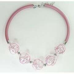 Колье женское из итальянского каучука розового цвета. Вставка- Муранское стекло белого и розового цвета. Длина колье-50,0см. Замок- карабин с удлиняющей цепочкой.