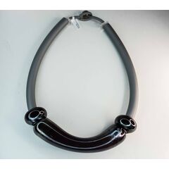 Колье женское (чокер) из каучука, цвет- черный и гипоаллергенного ювелирного сплава серого цвета. Вставка- муранское стекло черного и серого цвета с рисунком. Высота украшения из муранского стекла-4,0см. Длина колье-50,0см с удлиняющей цепочкой.