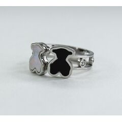 Кольцо женское из гипоаллергенного ювелирного сплава серого цвета. Вставка- перламутр и ювелирное стекло белого цвета.Покрытие эмалью, цвет- черный. Высота кольца-0,8см, ширина-2см. Размер-17,0. Кольцо незамкнутое.